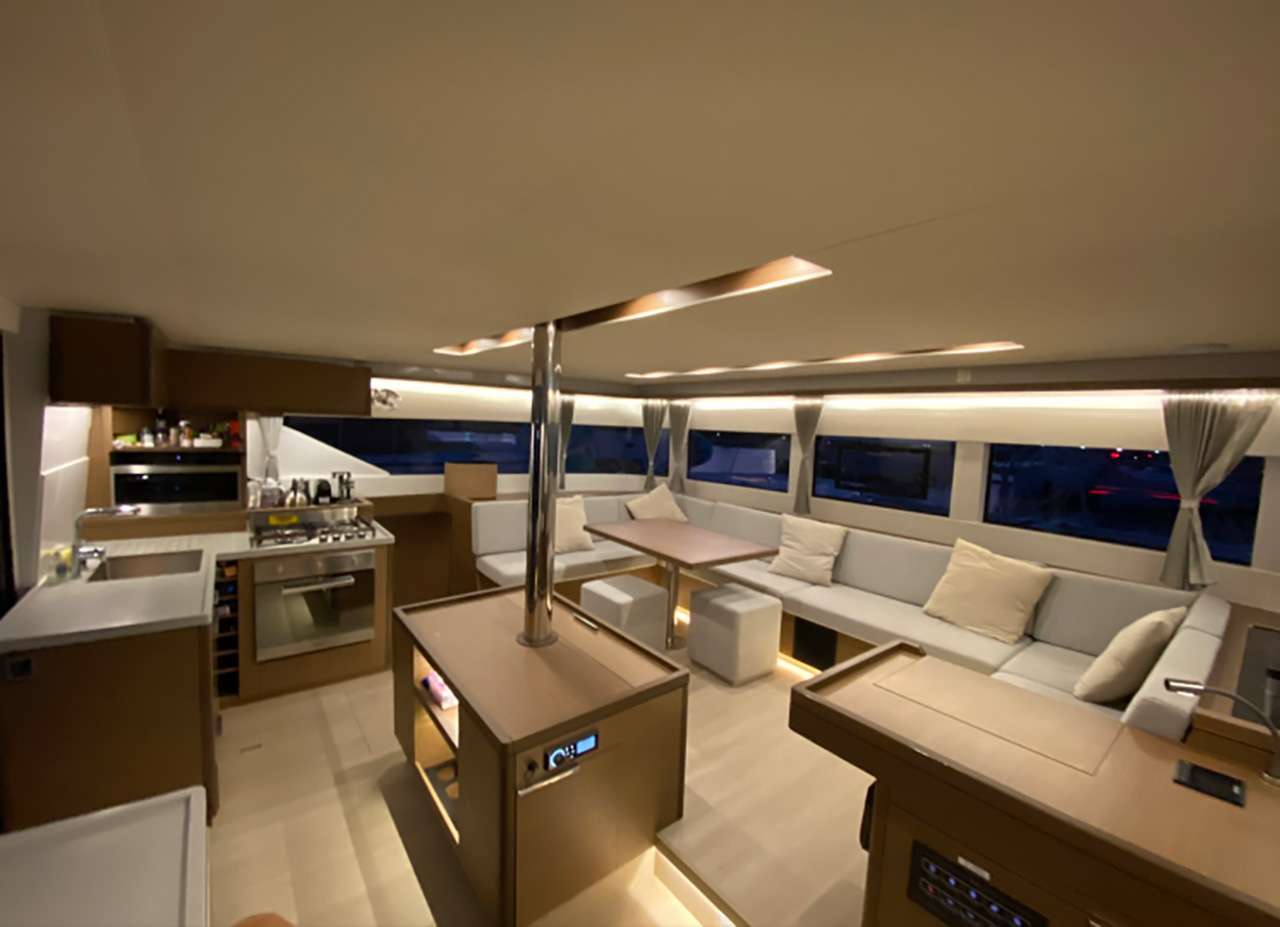 With a configuration optimized for charters, Swan offers accommodation in 4 queen size cabins and 4 en-suite heads to comfortably welcome up to 8 guests. Featuring full A/C in all cabins and the saloon area and dual 110v/220v sockets, Swan carries the latest safety and comfort equipment. The saloon area features a large table and sitting area for indoor entertainment as well as a fully equipped kitchen with several fridges and freezers. Lagoon innovative design offers great use of the space to cater for large groups. Guests can choose to relax in the spacious cockpit, on the large sunbeds of the flyover deck, or on the seating areas at the bow. Every inch of the boat is designed with the guests’ comfort in mind.
